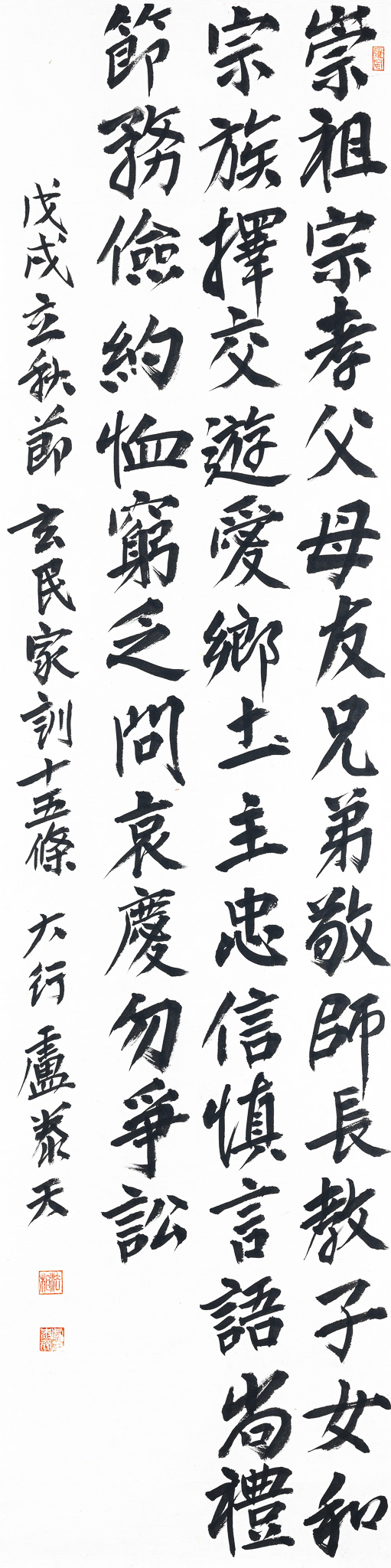 崇祖宗, 孝父母, 友兄弟, (숭조종, 효부모, 우형제,) 조상을 높이고, 부모에게 효도하며, 형제간에 우애가 있어라. 敬師長, 教子女, 和宗族, (경사장, 교자녀, 화종족,) 스승과 어른을 공경하고, 자녀를 가르치며, 친족 간에 화목하라. 擇交遊, 愛鄕土, 主忠信, (택교유, 애향토, 주충신,) 친구를 가려서 교유하고, 고향을 사랑하며, 충성과 신의를 중심으로 삼아라. 慎言語, 尚禮節, 務儉約, (신언어, 상예절, 무검약,) 말함에 삼가고, 예절을 받들며, 검약에 힘써라. 恤窮乏, 問哀慶, 勿爭訟. (휼궁핍, 문애경, 물쟁송.) 궁핍한 자들을 구휼하고, 경조사에 찾아보며, 다투며 송사 일으키지 마라.