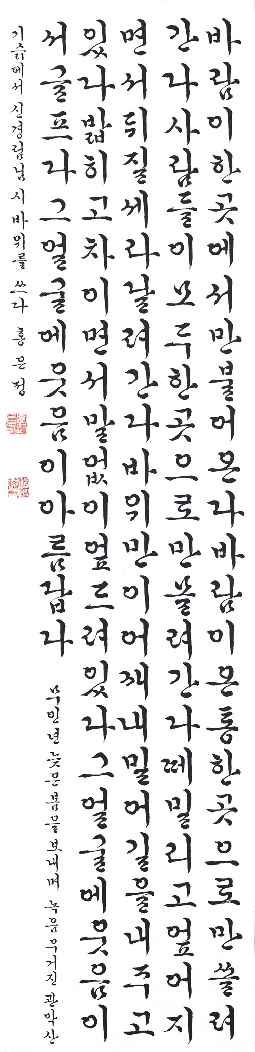 바람이 한 곳에서만 불어온다 바람이 온통 한 곳으로만 쓸려간다 사람들이 모두 한 곳으로만 몰려간다 떼밀리고 엎어지면서 뒤질세라 날려간다 바위만이 어깨 내밀어 길을 내주고 있다 밟히고 차이면서 말없이 엎드려 있다 그 얼굴에 웃음이 서글프다 그 얼굴에 웃음이 아름답다