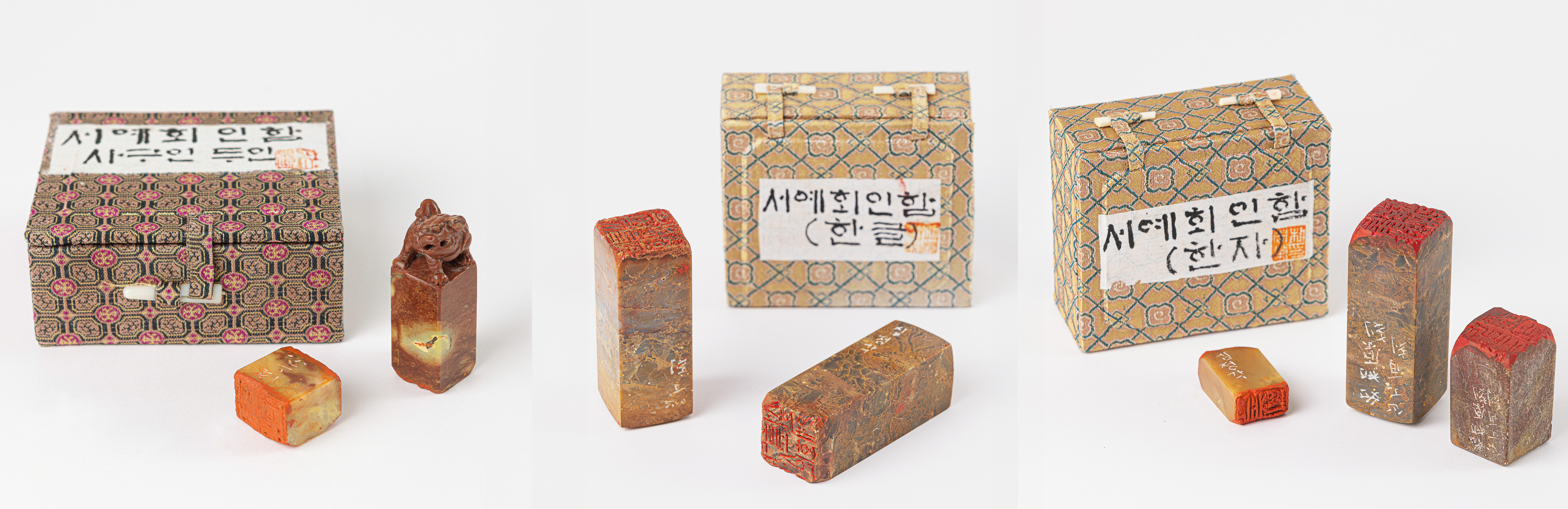 서울대 서예회의 인 (성명인) 갓바우뫼의 참멋글씨 (아호인) 한 뜻에 한 마음 (사구인, 두인) 침경자(적)사(枕經籍史) (성명인) 원수함춘(園樹含春) (아호인) 인지위덕(忍之爲德), 상선약수(上善若水), 대교약졸(大巧若拙) (사구인, 두인)
