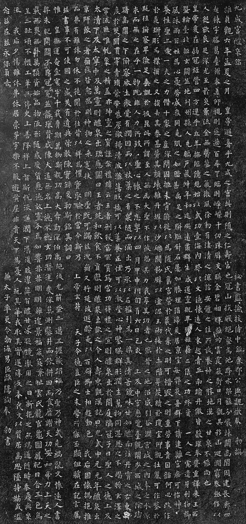 秘書監撿挍侍中鉅鹿郡公臣魏徵奉 勅撰. (비서감검교시중거록군공신위징봉 칙찬.) 비서감 검교시중 거록군공 신 위징이 칙명을 받들어 글을 짓는다. 惟貞觀六年孟夏之月, (유정관육년맹하지월) 정관 6년 맹하(음력 4월)에, 皇帝避暑乎九成之宮, 此則隨之仁壽宮也. (황제피서호구성지궁, 차칙수지인수궁야.) 황제(태종)가 구성궁으로 피서를 갔는데, 이는 수나라 때의 인수궁이다. 冠山抗殿, 絶壑爲池, 誇水架楹. (관산항전, 절학위지, 과수가영.) 산에 갓을 씌운 듯이 궁전을 올리고, 산골짜기를 끊어 못을 만들고, 계곡물을 가로질러 시렁과 기둥을 세웠다. 分巖竦闕, 高閣周建, 長廊四起, 棟宇膠葛, 臺榭參差. (분암송궐, 고각주건, 장랑사기, 동우요갈, 대사참차) 바위를 깎아 대궐을 세우고, 높은 누각이 두루 서있고, 장랑(긴 복도) 또한 사방에서 우뚝 솟았으니, 동우(마룻대와 처마 끝)는 어지러운 모양 으로 얽혀져 있고, 대사(누각과 정각)가 들쭉날쭉 세워져 있다. 仰視則迢遰百尋, 下臨則崢嶸千仞. (앙시즉초체백심, 하림즉쟁영천인.) 우러러 보면 아득히 멀리 백 길이나 되어 보이고, 아래로 내려다보면 가파르기가 천 길이나 되는듯하다. 珠璧交暎, 金碧相暉, 照灼雲霞, 蔽虧日月. (주벽교영, 금벽상휘, 조작운하, 폐휴일월.) 진주와 둥근 옥이 교차하여 비치니, 금빛과 푸른빛이 서로 광채를 내어, 구름과 안개에 선명하게 비추니, 해와 달의 빛마저 가릴 정도다. 觀其移山廻澗, 窮泰極侈, 以人從欲, 良足深尤. (관기이산회간, 궁극극치, 이인종욕, 량족심우.) 산을 옮기고 산골 물을 돌린 것을 보니, 안락과 화려함이 극도로 사치하여, 사람이면 다 욕심을 낼 만하다. 至於炎景流金, 無欝蒸之氣, 微風徐動, 有淒淸之涼, 信安體之佳所, 誠養神之勝地. (지어염경류금, 무울증지기, 미풍서동, 유처청지양, 신안체지가소 성양신지승지.) 불꽃 같은 햇볕에 쇠가 녹아 흐를듯한 더위에 이르러도, 답답하고 찌는듯한 기운이 없고, 미풍이 서서히 불고, 깨끗하고 서늘한 바람이 부니, 참으로 몸을 편안하게 즐기고, 양신(원기를 기르는 법의 하나)할 만한 경치 좋은 곳이다. 漢之甘泉, 不能尙也. (한지감천, 불능상야) 한(漢) 나라의 감천궁(甘泉宮)도 능히 이보다 나을 수는 없을 것이다. 皇帝爰在弱冠, 經營四方, 逮乎立年, 撫臨億兆. (황제원재약관, 경영사방, 체호입년, 무림억조.) 황제께서는 일찍이 약관에 사방을 경영하셨으며, 입년(서른 살 때)에 온 백성을 돌보셨다. 始以武功壹海內, 終以文德懷遠人. (시이무공일해내, 종이문덕회원인.) 처음에는 무왕(武王)의 공으로 해내를 하나로 통일하셨고, 끝으로는 문왕(文王)의 덕으로 먼 나라 사람들까지 품으셨다. 東越靑丘, 南踰丹儌, 皆獻琛奉贄, 重譯來王. (종이문덕회원인 동월청구 남유단교, 개헌침봉지 중역래왕.) 동으로는 청구(한반도)를 넘고 남으로는 단교(남쪽 변방)까지, 모두가 보물을 바치고 폐백을 받들며, 통역을 거듭하며 내왕하였다. 西曁輪臺, 北拒玄闕, 並地列州縣, 人充編戶, 氣淑年和. (서기윤대, 북거현궐, 병지열주현, 인충편호, 기숙년화) 서쪽으로 윤대(현 신장위구르자치구) 및 북쪽으로 현궐(현 바이칼 호 근방)까지 떨쳐, 땅을 병합하고 주현을 벌이니, 사람들을 채워 호로 편제하고, 기후는 맑고 해마다 풍년이 들었다. 邇安遠肅, 群生咸遂, 靈貺畢臻, 雖藉二儀之功, 終資一人之慮. (이안원숙, 군생함수, 영황필진, 수자이의지공, 종자일인지려.) 가까운 곳은 안락하고 멀리는 고요하니, 중생이 모두 따르고, 신령이 내려준 복도 다 하니, 비록 천지의 공덕을 입었으나, 결국은 한 사람(황제)이 염려한 덕이다. 遺身利物, 櫛風沐雨, 百姓爲心, 憂勞成疾, 同堯肌之如腊, 甚禹足之胼胝, 針石屢加, 腠理猶滯. (유신이물, 즐풍목우, 백성위심, 우노성질, 동요기지여석, 심우족지변지, 침석누가, 주리유체.) 몸을 버려 만물을 이롭게 하고, 바람에 머리를 빗고, 비에 몸을 씻으면서, 백성을 위하는 마음에, 걱정과 노고가 질병을 이루어, 요임금과 같이 살갗이 건포처럼 거칠고, 우임금 발의 굳은살보다 심하여, 침석으로 치료하여도 주리(살가죽 겉에 생긴 자디잔 금)는 오히려 엉기었다. 爰居京室, 每弊炎暑 群下請建離宮 庶可怡神養性. (원거경실, 매폐염서, 군하청건이궁, 서가이신양성.) 이러함에도 장안 황실에 머무르셔서, 매번 불볕더위에 몸을 해치시니, 여러 신하가 이궁을 짓도록 청하여, 정신을 유쾌하게 하고 천성을 기르실 것을 바랐다. 聖上愛一夫之力, 惜十家之産, 深閉固拒, 未肯俯從, (성상애일부지력, 석십가지산, 심폐고거,) 황제께서는 한 사람의 힘조차 사랑하시고, 열집의 재산도 아끼시어, 마음을 깊게 닫고 확고히 거절하셨는데, 따라주기를 즐겨하지 아니하시고 생각하시기를, 「以爲隋氏舊宮, 營於曩代, 棄之則可惜, 毁之則重勞, 事貴因循, 何必改作.」 (미긍부종 이위수씨구궁 영어낭대)(기지칙가석 훼지칙중노 사귀인순) “수나라 때의 옛 궁전은, 앞선 시대에도 사용되었던 것으로, 버리기는 몹시 아깝고 허물기도 많은 노력이 드는 법이니, 일이란 순리를 따르는 것을 중히 여기거늘, 어찌 반드시 고치어 새로 짓는 것이냐?” 於是斲彫爲樸, 損之又